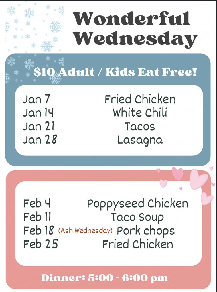 Wonderful Wednesdays offer the chance to share meals together at 5:00 pm in the Fellowship Hall. We break out into study groups from 6:00 pm to 7:00 pm. Classes are tailored for all ages.